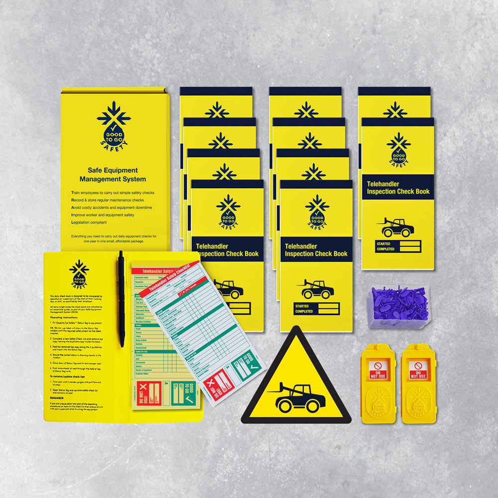Each kit comes in a sturdy highly visible box which is ideal for storing used checkbooks for management records. The kit contains 275 individual (one for each day - working week) Telehandler inspections relating to the components and functionality of a Telehandler. Duplicate carbon copies of the completed inspection checklists are retained in the book for management records. The book also includes useful guidance notes to remind operatives what to look for during their Telehandler inspection. The kit also contains 2 status tags which when positioned and attached to the entrance of a Telehandler is a ideal way to advise employees when the equipment is "Good to Go" following a pre-use inspection. If a fault is found then the tag can display a "Do Not Use" message to quarantine the equipment until repaired and another inspection deems the Telehandler is safe for use. A useful wallet and pen which securely holds the book and pen to protect it from general wear and tear whilst providing a perfect writing surface whilst on the move. The kit also provides 300 tamper evident seals which provide a visual indicator that the checklist insert is in place and verified.